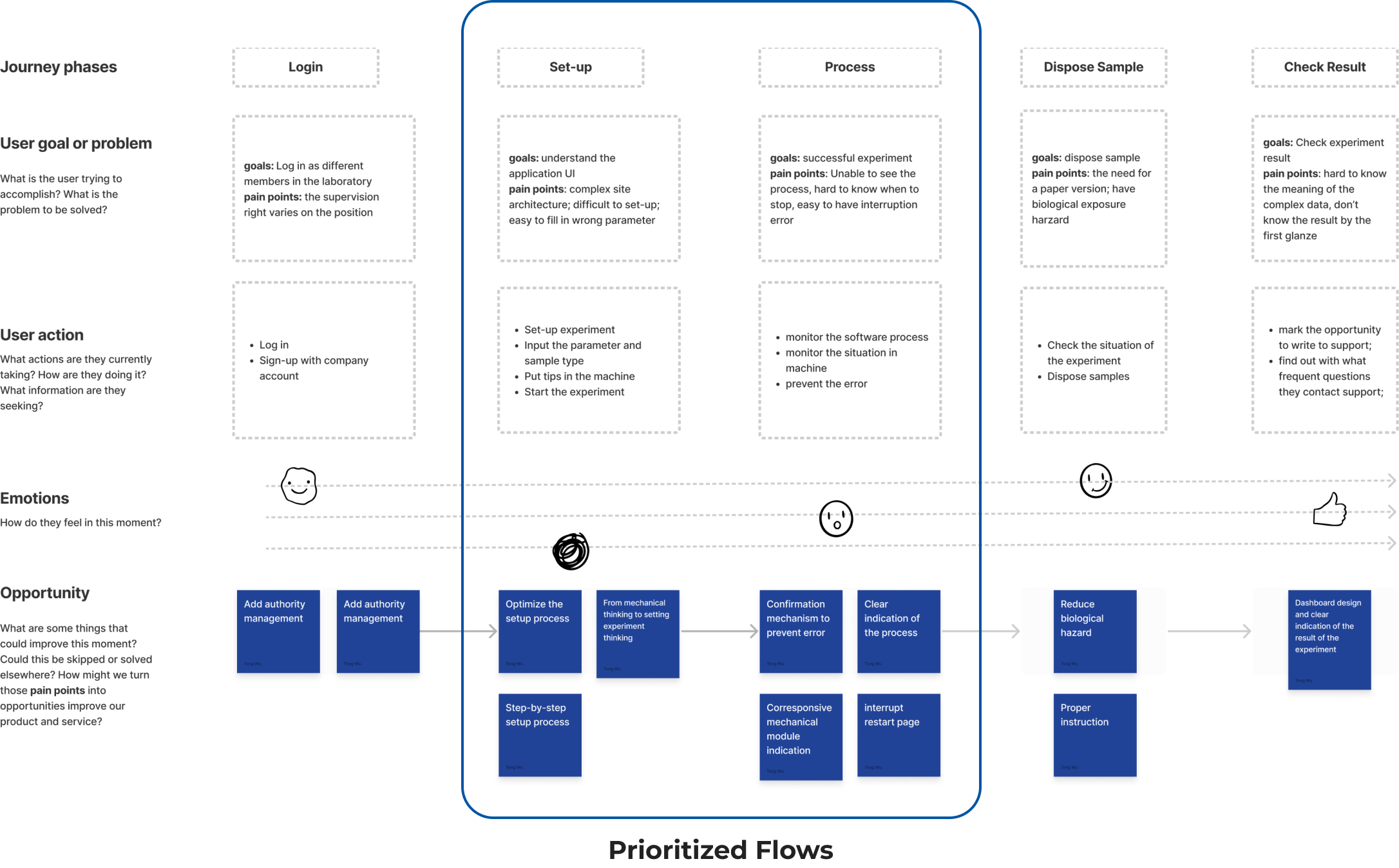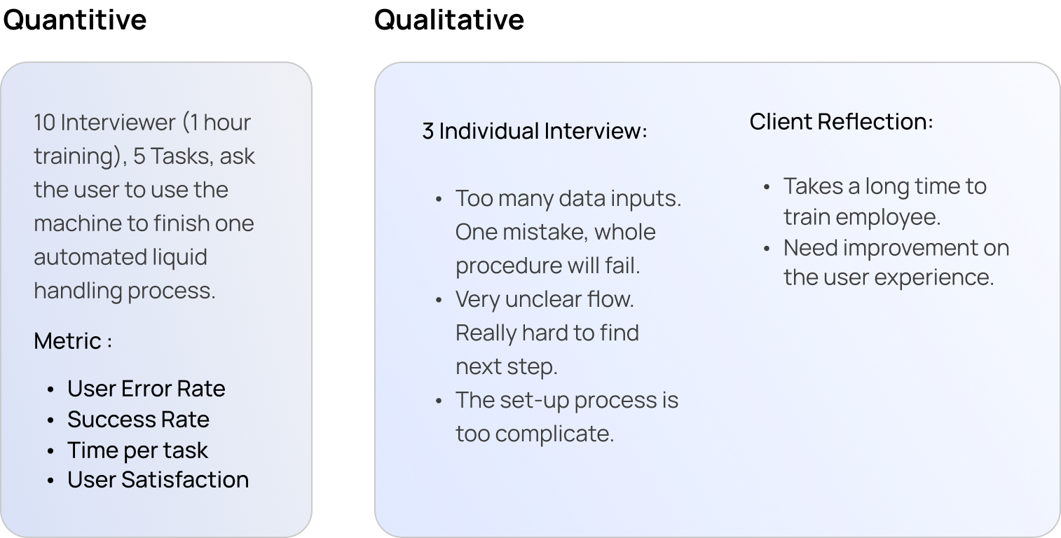 After conducting interviews with key stakeholders, including research scientists, technologists in the diagnosis department, and the company's QA team, it became evident that Molarray's liquid handling system was posing challenges in terms of usability issue, leading to significant training and installation costs. The dashboard proved to be particularly cumbersome for users, resulting in frequent errors. Additionally, we collaborated with the business owner and identified that these usability were also impeding the product's entry into the broader market, resulting in revenue limitations. To address these challenges, we conducted further research to analyze the problem.