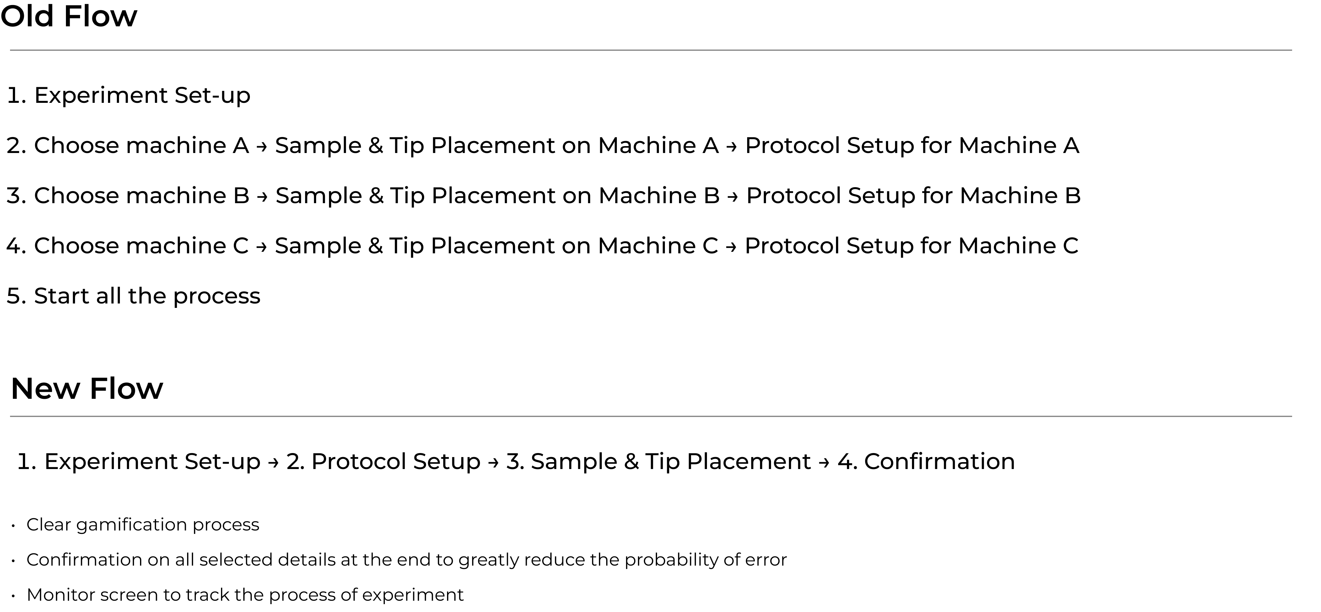Furthermore, I made significant improvements to the workflow. In the previous version, the machine was divided into three sections, necessitating the technician to set it up 3 separate times. However, by aligning with the mindset of the biological technician and their experimental approach, I consolidated the workflow into a single streamlined process for setting up the protocol.